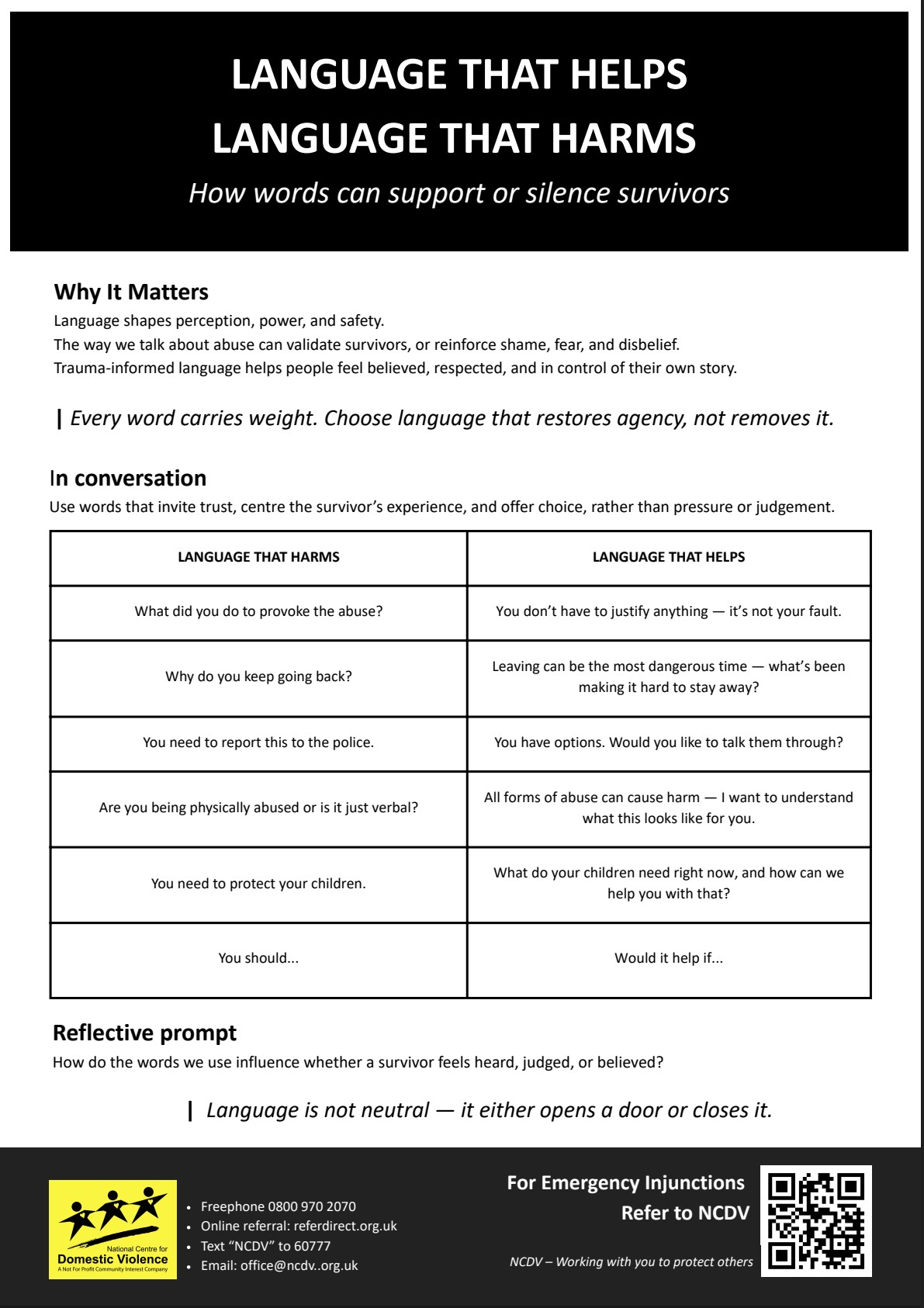 These resources are designed for professionals working in the domestic abuse and safeguarding sectors. Each one supports deeper reflection on language, bias, trauma and intersectionality, helping you strengthen practice and promote safer, more inclusive responses.